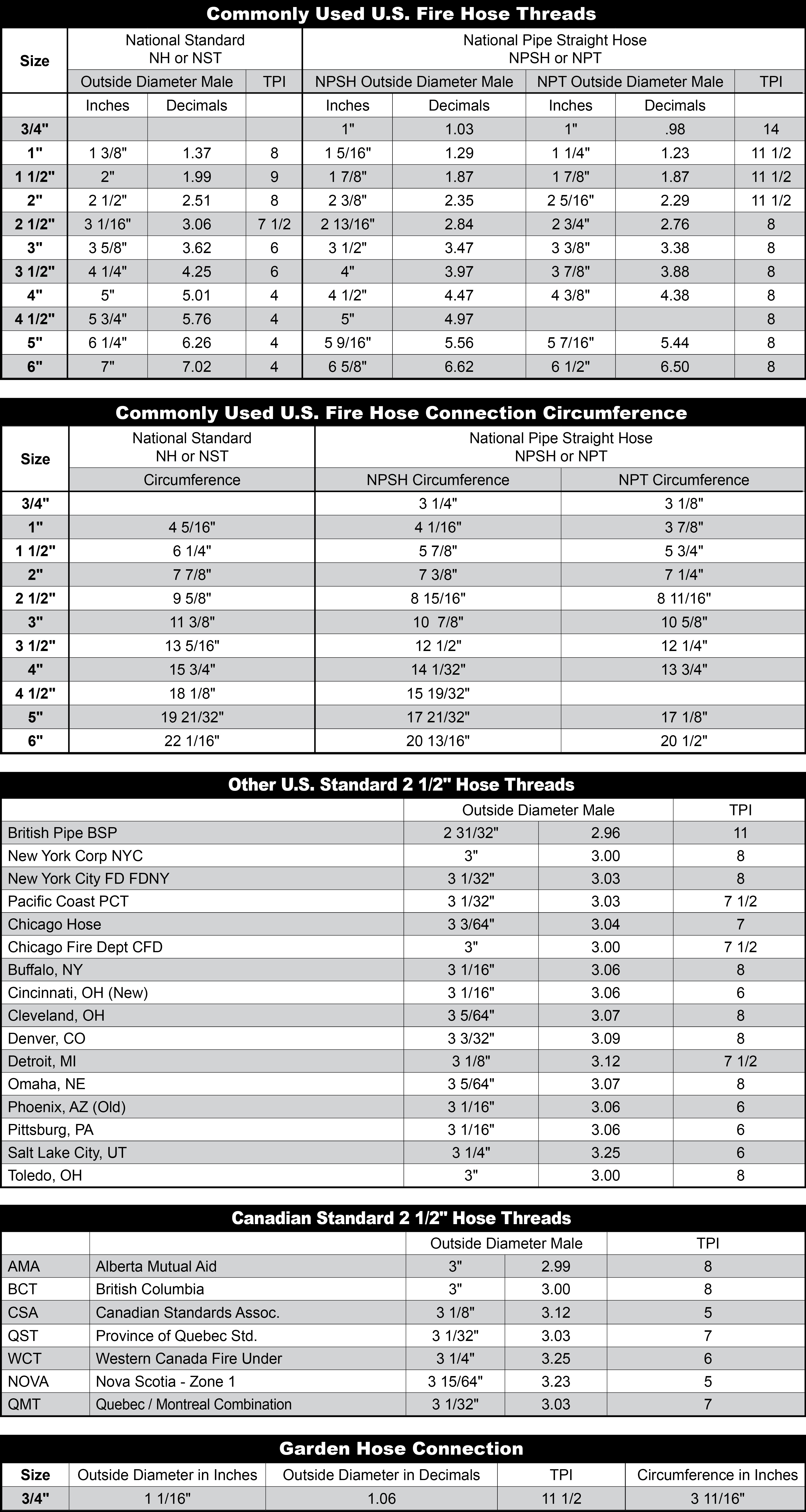 The most common thread type in use by United States Fire Departments today is National Hose (NH). It is also called National Standard Thread (NST) or National Hose Thread (NHT). It is often referred to as “fire hose thread”. NH, NST and NHT are different abbreviations for the exact same thread.