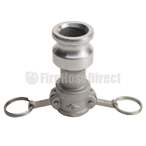 Aluminum 1 inch female camlock (Cam & Groove) coupler to 1 1/2 inch male camlock (Cam & Groove) coupler. Under no circumstances should cam and groove couplings be used for compressed air or steam service!