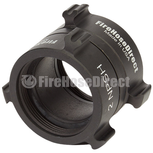 Aluminum adapters are fabricated from seamless extruded 6061-T6 aluminum and hard coat anodized per MIL-A-8625 Type III, Class 1. Threads have a blunt start Higbee cut with indicators on adjacent lugs. Part identifications are permanent and stamped prior to hardcoat. Adapters and components meet the requirements of NFPA 1963.