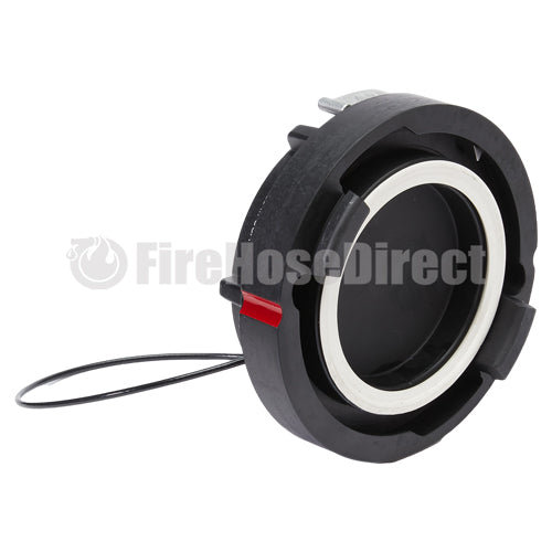 Aluminum storz cap with cable. Machined from forged 6061 - T6 aluminum and anodized. Buna-N gaskets to resist most hydrocarbons, oils, gasoline, acids and greases. Complies with DIN standards which require that Storz heads must be forged when used in firefighting applications.
