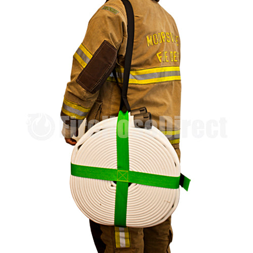The Double Donut Strap holds two 50-foot sections of 1 3/4" hose. Heavy-duty nylon webbing and high-sheer strength Velcro make up this strong and functional product. Important features include: Easy storage - hose stacks and is compact enough to fit into compartments. 23" Shoulder strap aids firefighters in carrying and deploying hose. Pre-coiled hose gives you option to add on to an existing hose lay, or reduce a larger line.