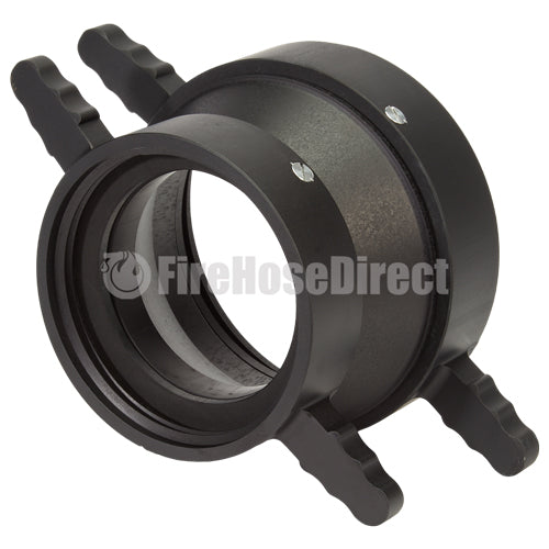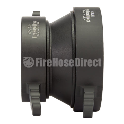 Aluminum adapters are fabricated from seamless extruded 6061-T6 aluminum and hard coat anodized per MIL-A-8625 Type III, Class 1. Threads have a blunt start Higbee cut with indicators on adjacent lugs. Part identifications are permanent and stamped prior to hardcoat. Adapters and components meet the requirements of NFPA 1963.