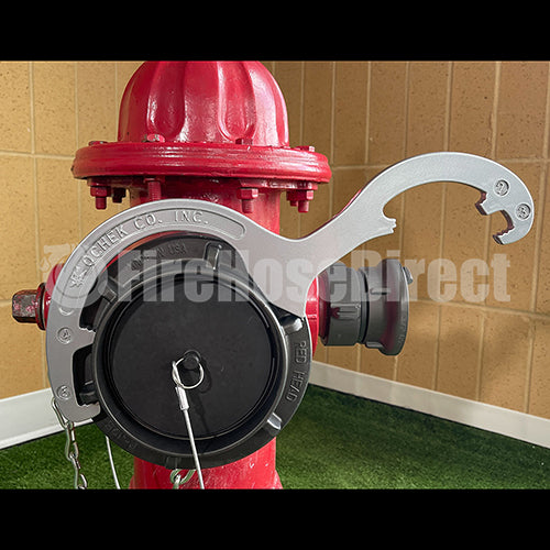 Storz spanner wrench. Fits 1 1/2", 2", 2 1/2", 3", 4" and 5" Storz couplings. Aluminum powder coated tool that combines a Storz wrench with a universal rocker lug spanner wrench. Spanners have smoothly rounded edges. Wrench is stamped 2, 3, 4 and 5 for quick reference.