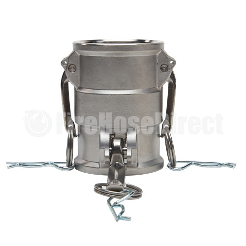 Type "DD" spool stainless steel 1 1/2 inch female camlock (Cam & Groove) coupler to 1 1/2 inch female camlock (Cam & Groove). Under no circumstances should cam and groove couplings be used for compressed air or steam service!