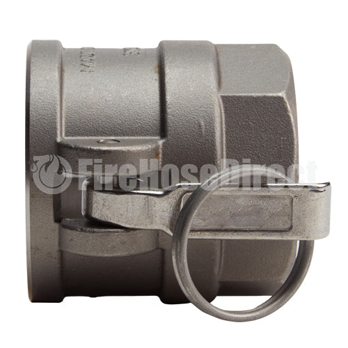 Type "D" stainless steel 2 inch female camlock (Cam & Groove) coupler to 2 inch female NPT threads. Under no circumstances should cam and groove couplings be used for compressed air or steam service!