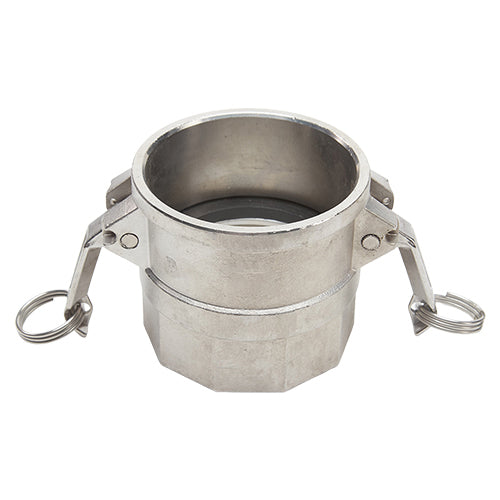 Type "D" stainless steel 3 inch female camlock (Cam & Groove) coupler to 2 inch female NPT threads. Under no circumstances should cam and groove couplings be used for compressed air or steam service!