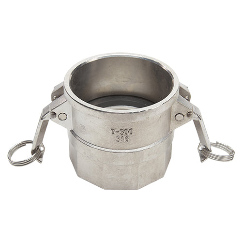 Type "D" stainless steel 3 inch female camlock (Cam & Groove) coupler to 3 inch female NPT threads. Under no circumstances should cam and groove couplings be used for compressed air or steam service!
