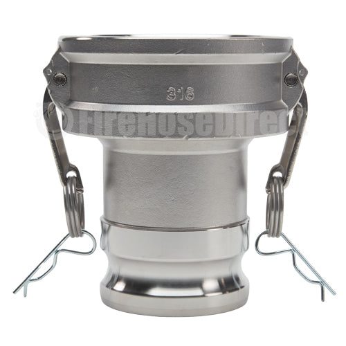 Jump size Stainless Steel 4 inch female camlock (Cam & Groove) coupler to 3 inch male camlock (Cam & Groove) coupler. Under no circumstances should cam and groove couplings be used for compressed air or steam service!
